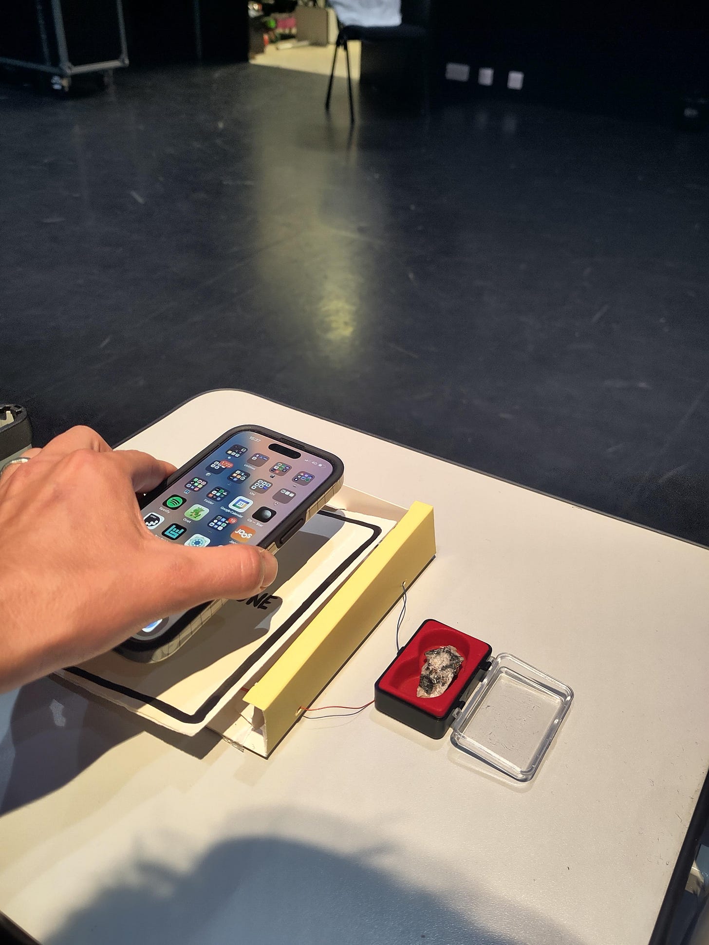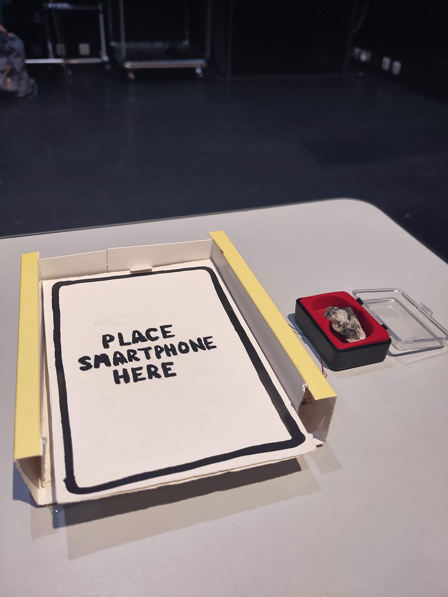 I exhibited a small interactive physical sculpture called ‘Tungestun Touch’ that connects one of the many geological minerals used in electronics with their technical application in a smart phone. A mineral sample of Wolframite (the ore from which tungsten is extracted) is connected to a 3v cell vibration motor that vibrates when a phone is placed onto the sculpture, replicating how tungsten is actually used as a counter-weight to increase the physical vibration in a smart phone (link).